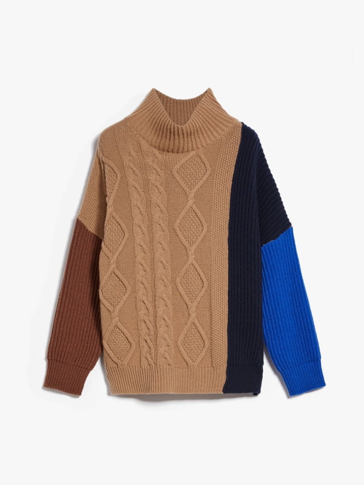 Maglia patchwork in filato di pura lana con collo dolcevita e maniche lunghe a giro basso. La lavorazione a coste e a trecce dona carattere alla texture. Lunghezza 70 cm.